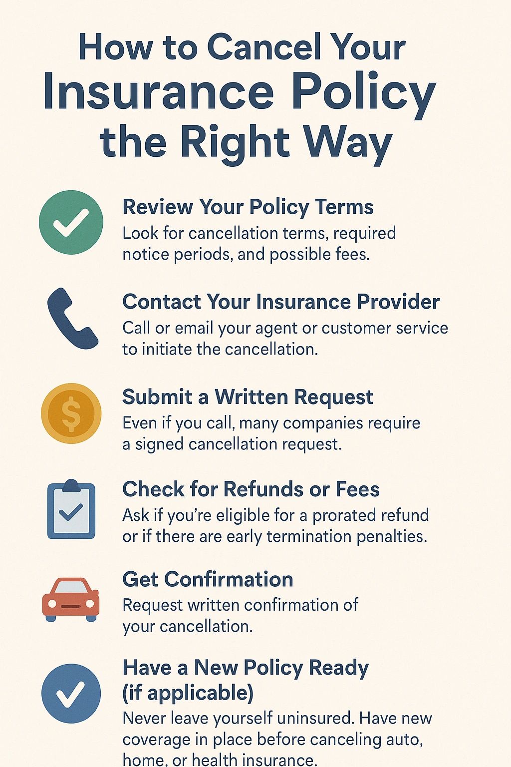 1. Review Your Policy Terms Before you cancel, check your current policy for: Cancellation procedures Required notice periods Any early termination fees Potential refunds on unused premiums